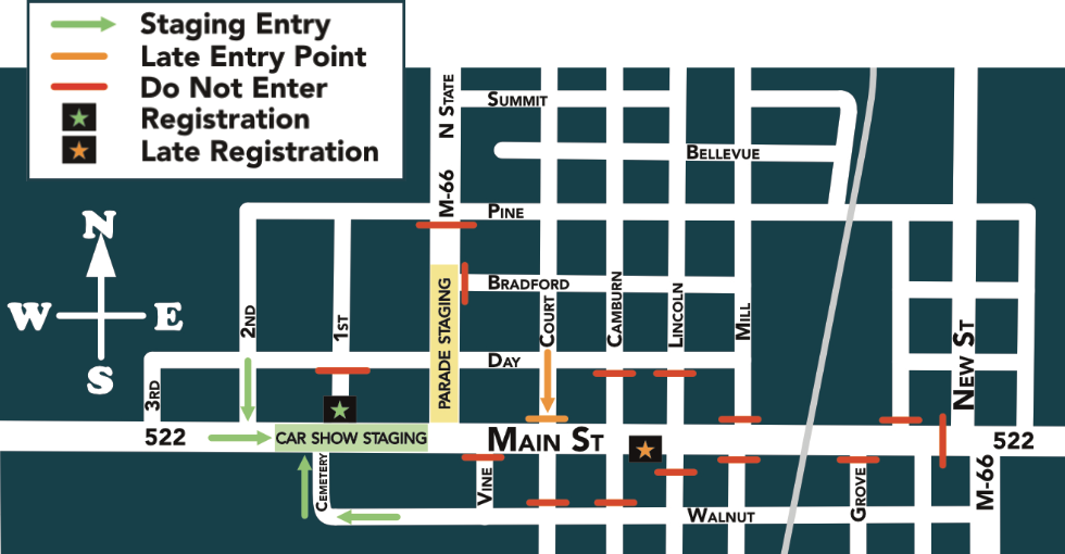 IMPORTANT: To enter your vehicle, registration and staging is from Noon to 2:00 p.m. at the intersection of Main (522) and W 1st St. (Please refer to the map below, and follow the signs for Car Show Registration.) Wait for assistance to go through the barricades that will be manned at both Cemetery St and 2nd St. to move into the staging area. For cars not arriving in time for staging, pull up to the barricade at N Court Street from the north and wait to be directed to a spot. After parking, report to the relocated registration booth in front of The Commons building on Main Street.